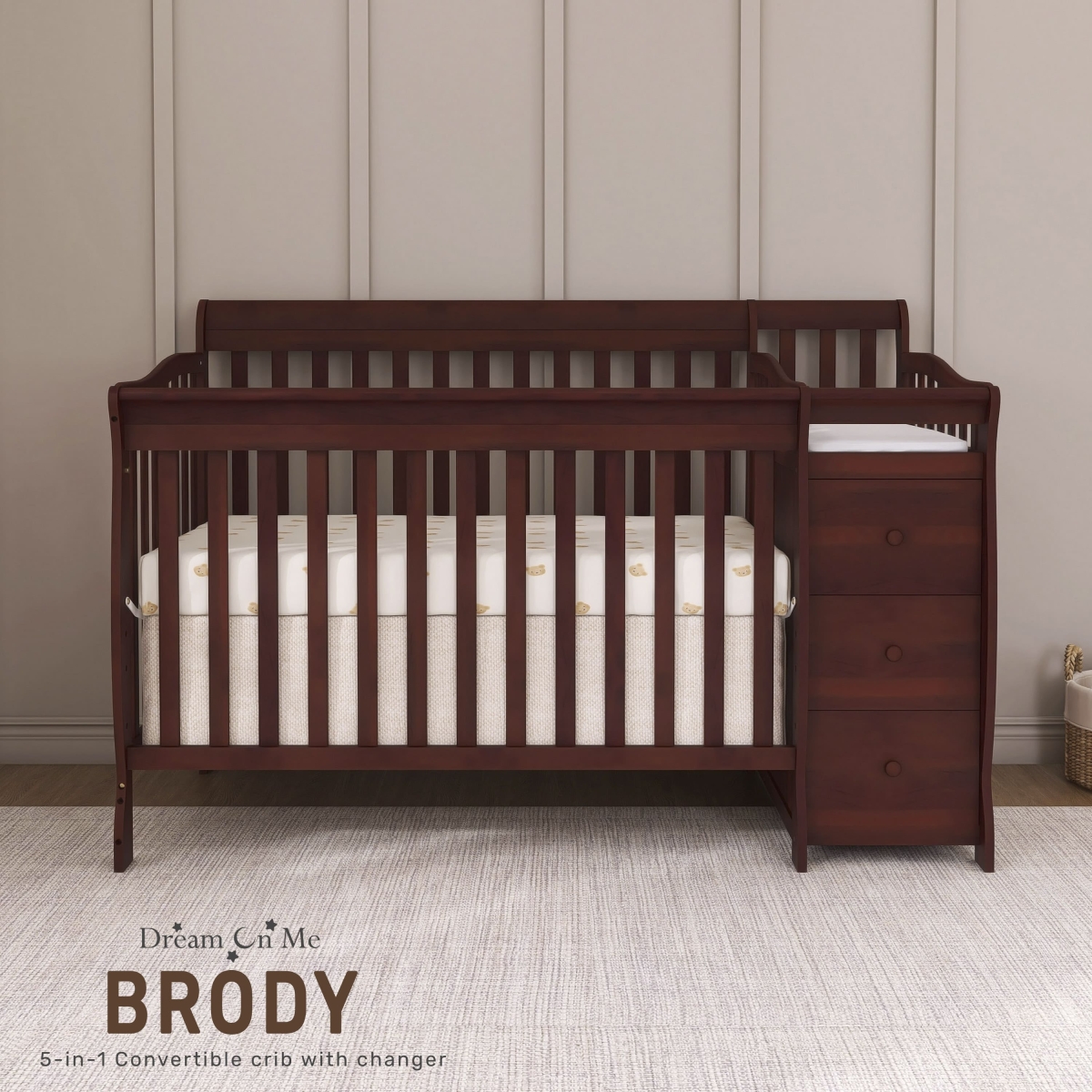 - OPTIONS DE CONVERTIBILITÉ : Les transitions Brody avec votre bébé ! Transformez-le d'un berceau en lit pour tout-petit, en lit de jour et pour convertir le berceau Brody en lit double avec les barrières de lit double Brody Conversion Post #699. Attached is a three-drawer changing table making this a must-have nursery piece.