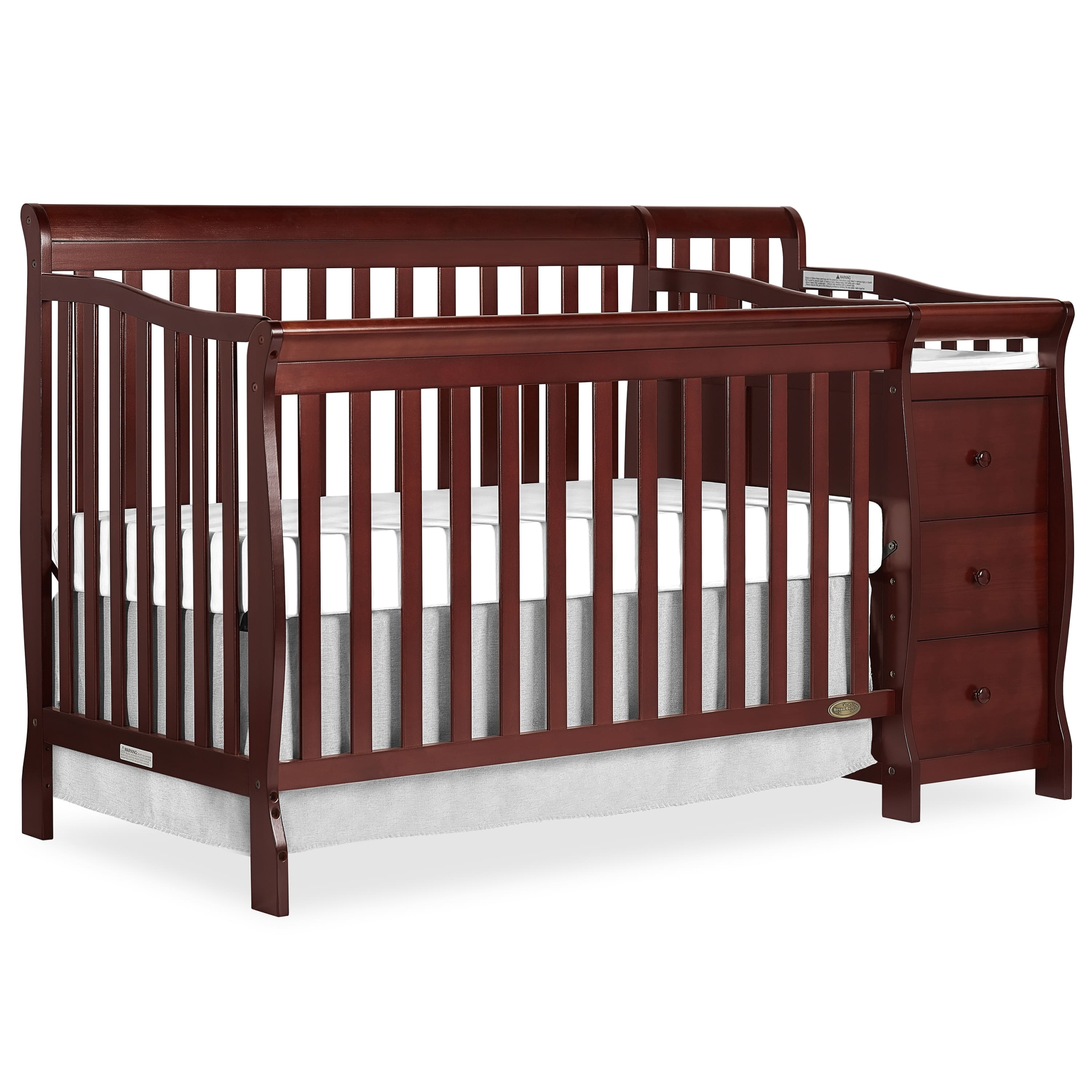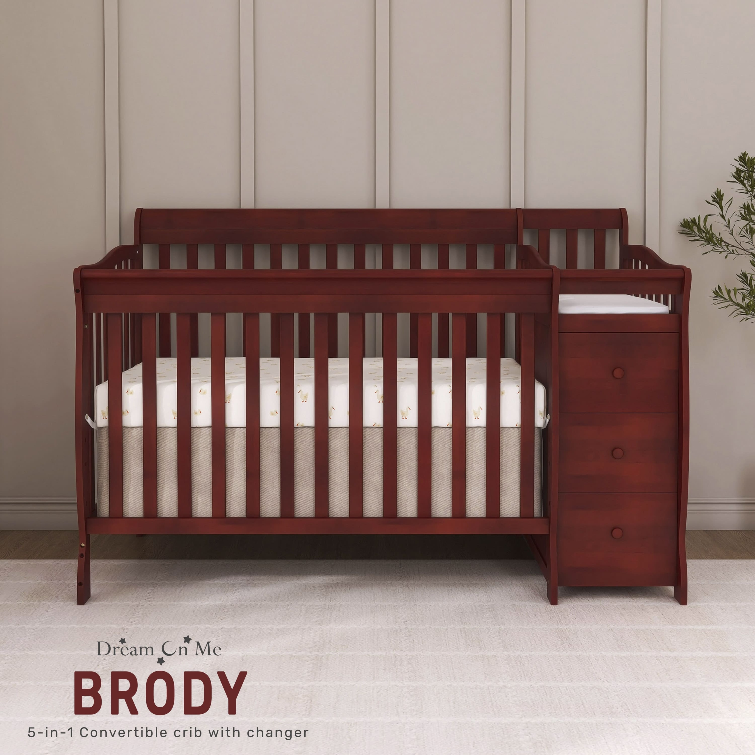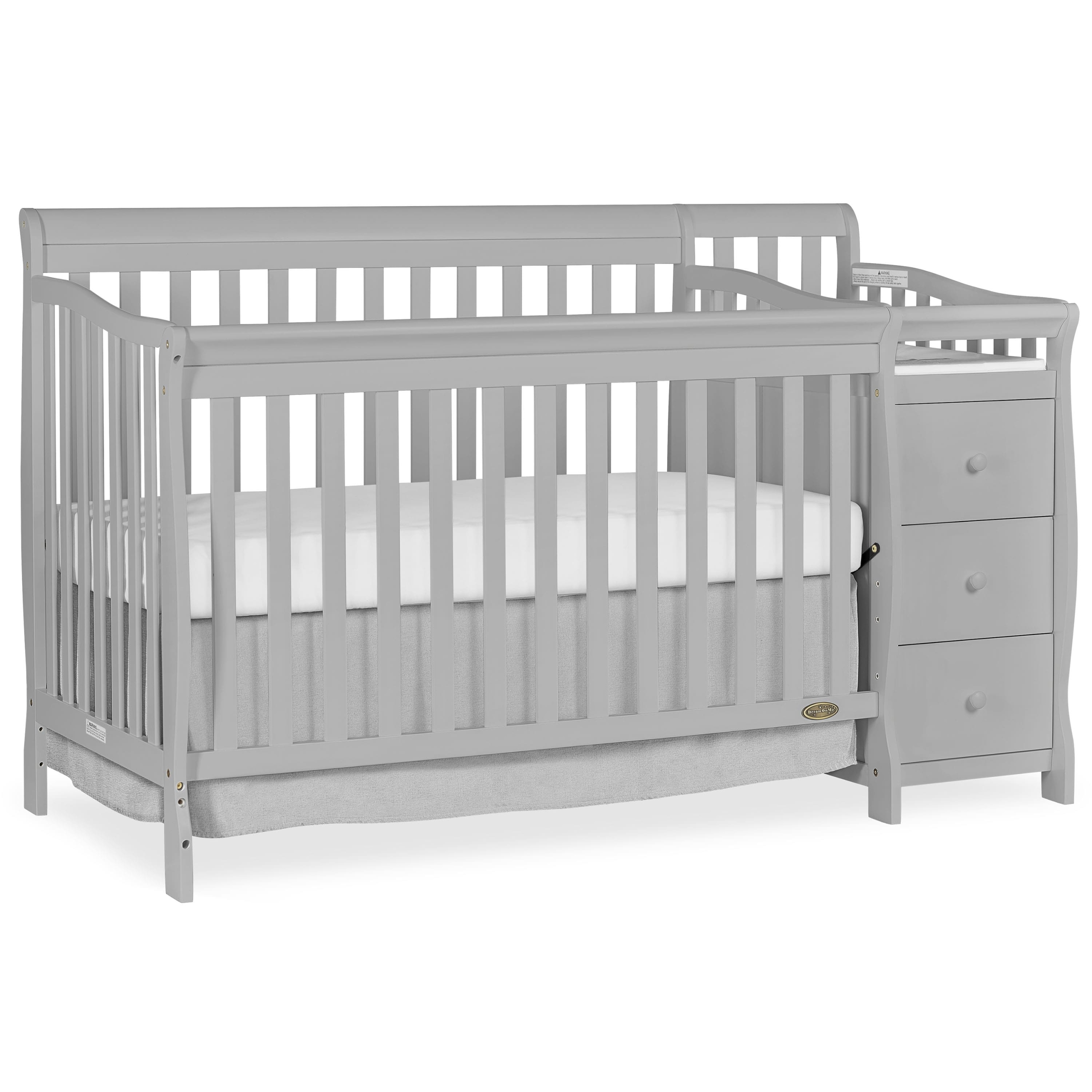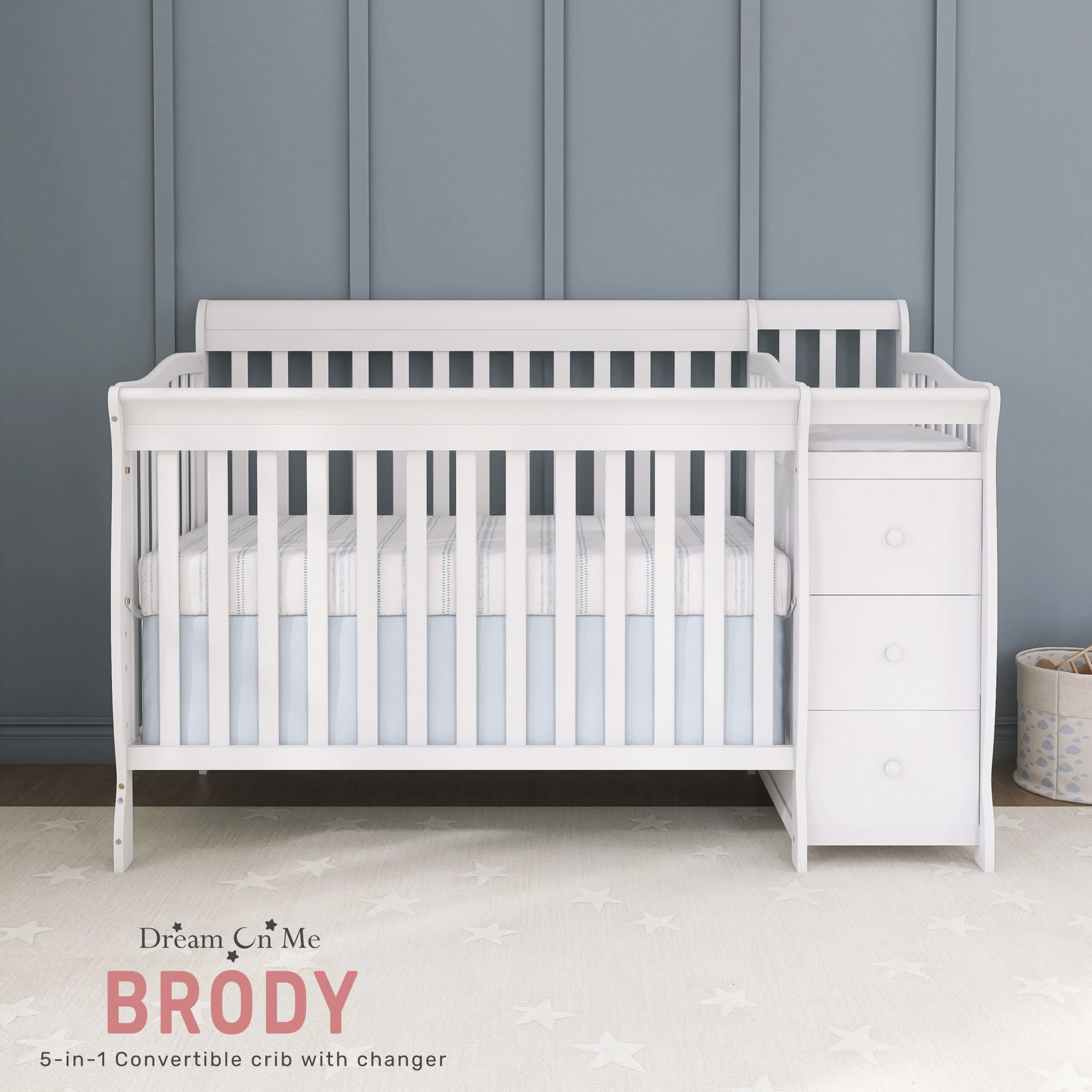 The Brody 5-in-1 Convertible Crib with Changer is the piece of furniture your nursery cannot do without! Laden with features, it grows with your child, making it a must-have! Convert it from a crib to a toddler bed, a day bed and then a full-size bed (Toddler Guard Rail #692 & Conversion Post #699 sold separately). This crib comes with a stationary (non-drop side) rail system for safety and convenient three-height mattress settings. And that’s not all! The Brody comes with a detachable three-drawer changing table! The table has a custom fit 1” changing pad, and is fitted with a security strap with an easy release buckle to secure the baby safely. The 3 spacious drawers are ideal to store baby essentials. Built of durable pinewood, the Brody has a stylish and classic design that blends beautifully into any nursery decor. Choose from beautiful finishes. All Dream On Me cribs are tested to ensure all applicable ASTM, JPMA standards are met. Product dimensions are 69 L x 33.2 W x 39.1 H inches. Choose any Dream On Me non-toxic, Greenguard certified standard crib mattress for the perfect fit. All tools for assembly are included.