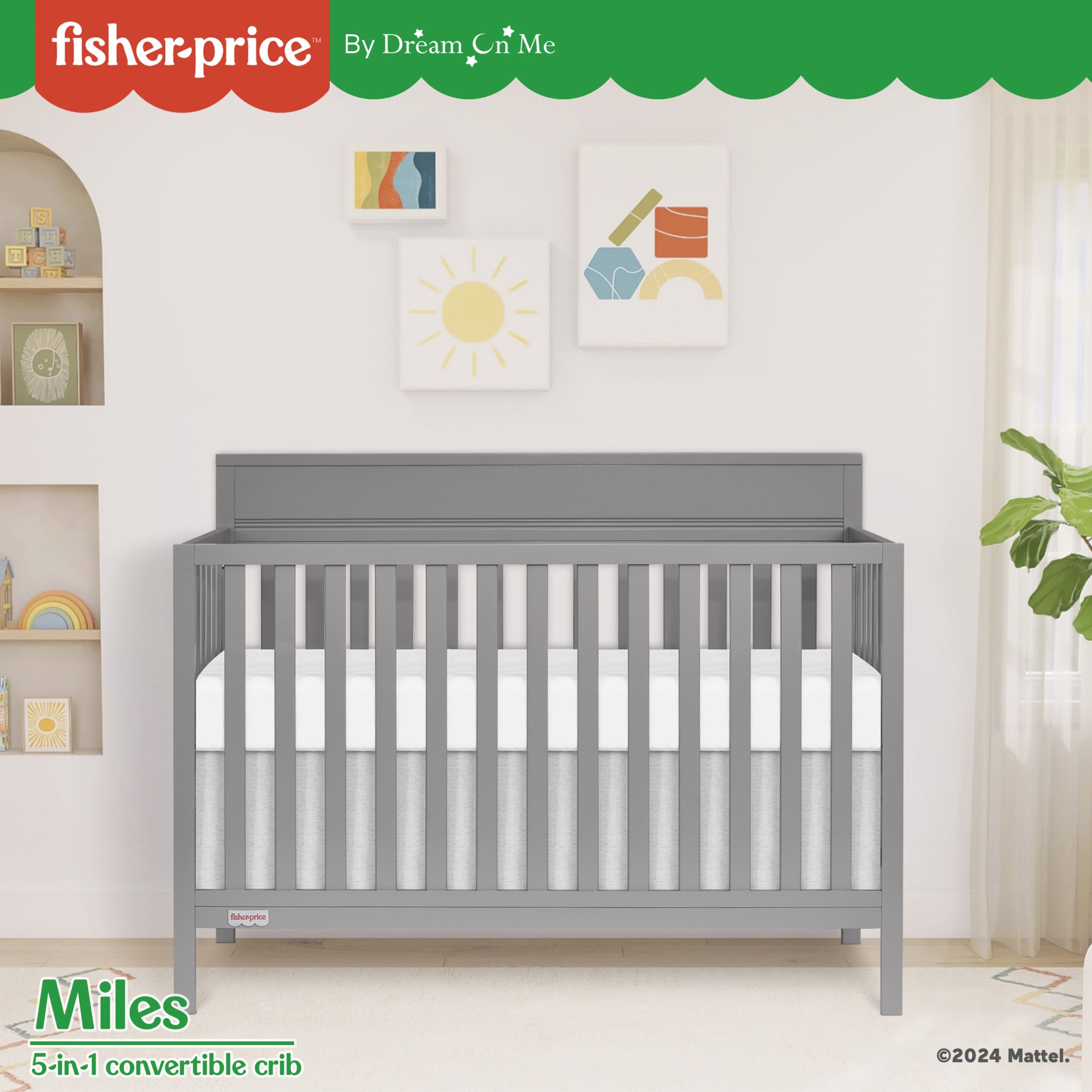 - A TRUE MUTI-TASKER: The Fisher Price™ Miles 5-in-1 Convertible Crib is a true multitasker, transforming effortlessly into a toddler bed, full-size bed, and daybed. But wait, there's more! Maintaining the Fisher Price Miles 5-in-1 Convertible Crib's pristine look is a breeze – simply spot or wipe clean.