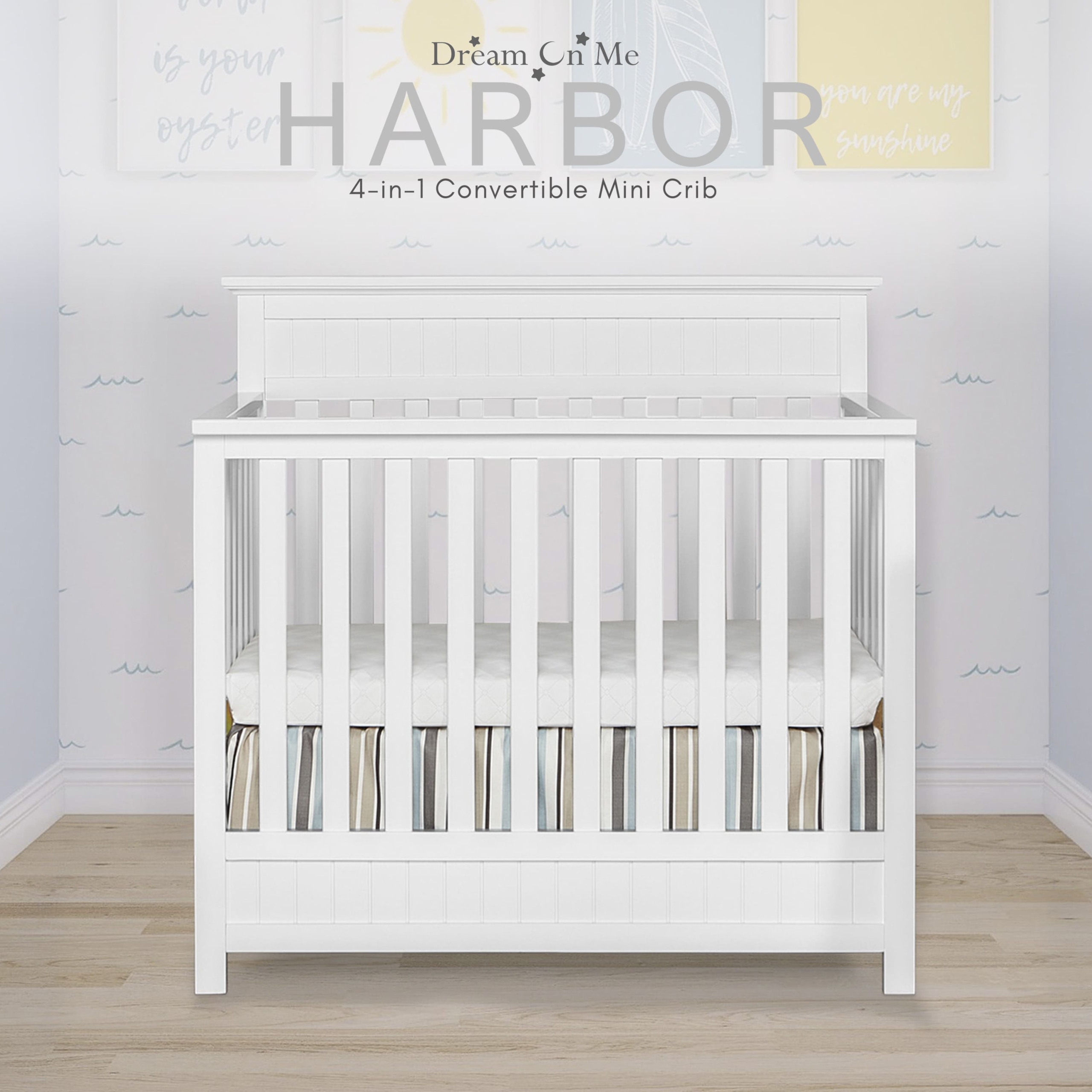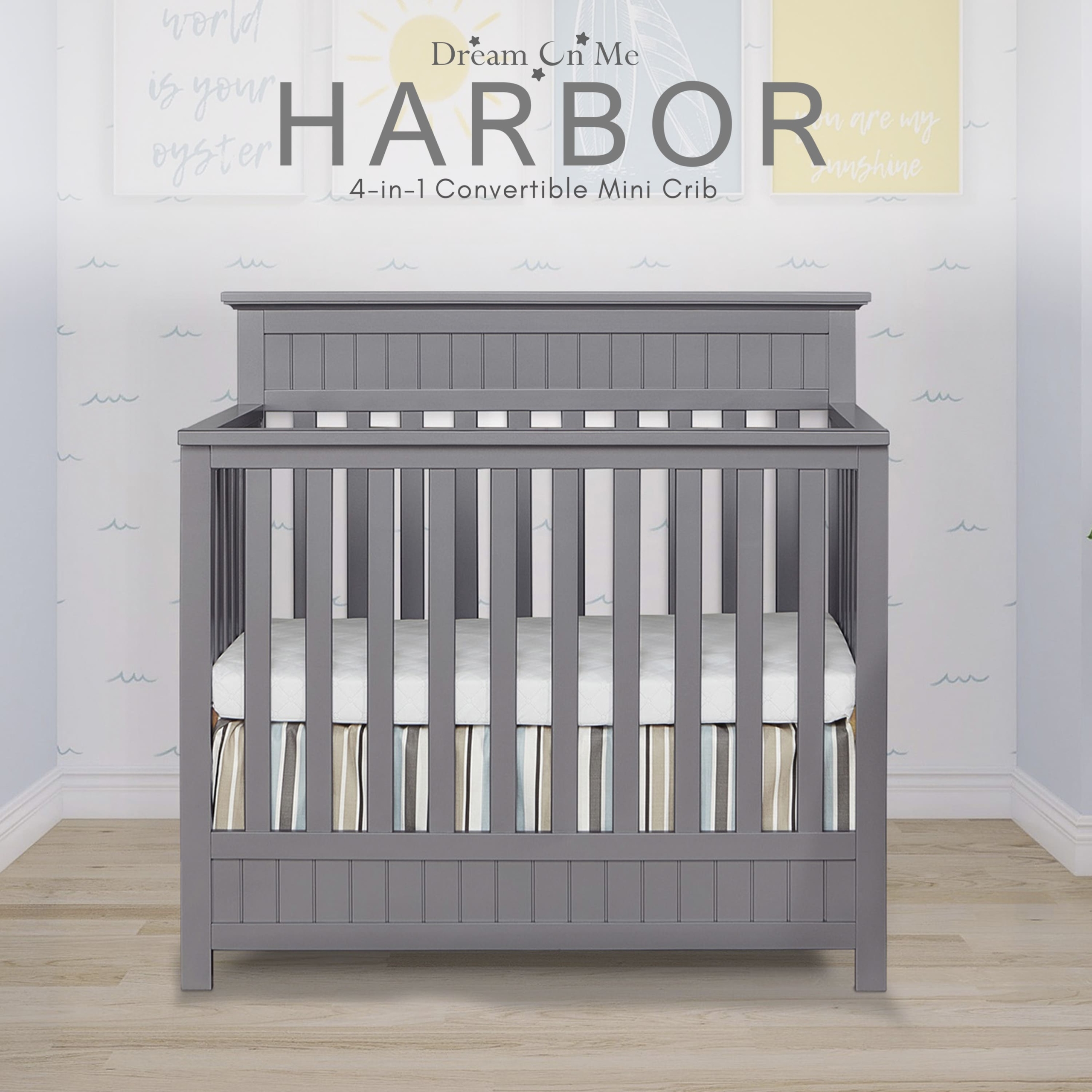 - CONVERTIBILITY OPTIONS: The Harbor 4-in-1 Convertible Mini Crib is a convenient way to keep pace with your child’s changing needs. Use it as a crib; as your baby grows, convert it into a mini daybed and twin-size bed (bed rails and frame sold separately).