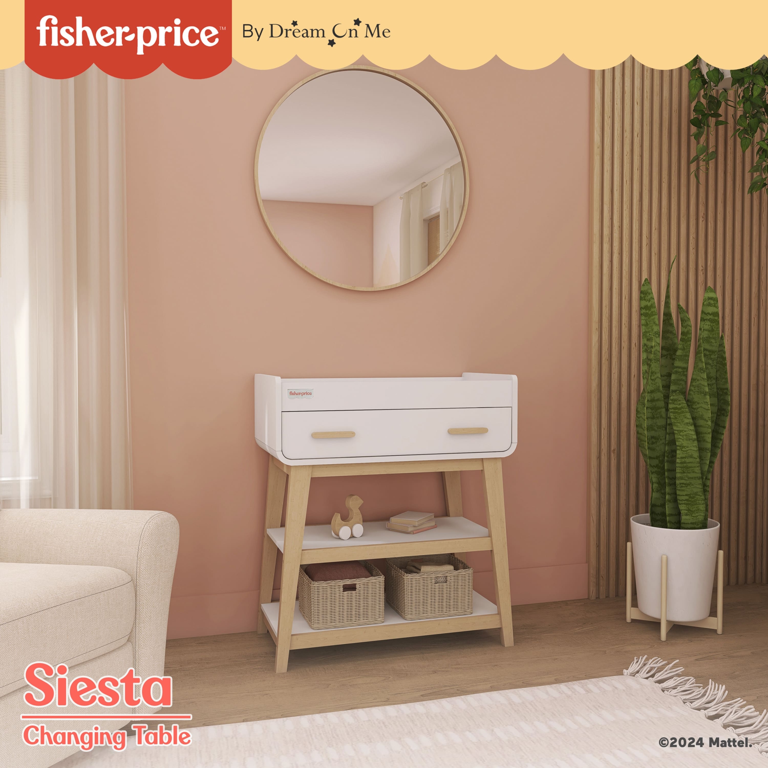 Say goodbye to diaper changing woes and hello to convenience with the Fisher-Price™ Iris/Siesta Changing Table by Dream On Me! Made from durable New Zealand Pine Wood, this changing table is not only sturdy but also easy to maintain. The bottom closed drawer and two open shelves provide ample storage space for all your diapering essentials and more, keeping everything organized and within reach. Safety and functionality are at the heart of our design. The changing table is JPMA & Greenguard Gold certified and meets/exceeds the ASTM & CPSC safety standards. Available in pleasant variations – Blush Pink, Matte Black Vintage Oak and Vintage White Oak – each option is carefully crafted to suit your style preferences and nursery décor. Product dimensions are 33.9″ L x 18.5″ W x 38.4″ H, with a weight of 66 Lbs.