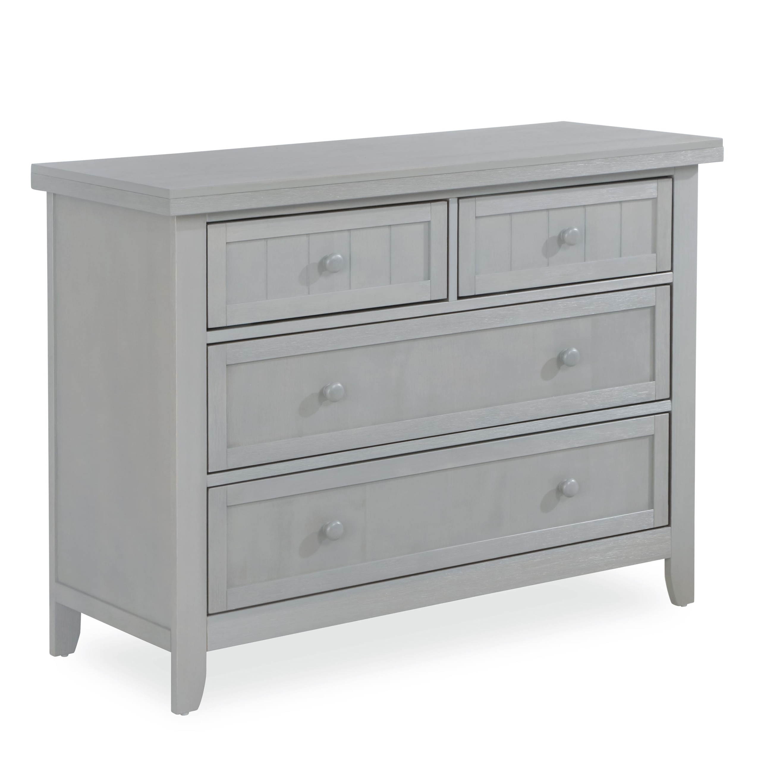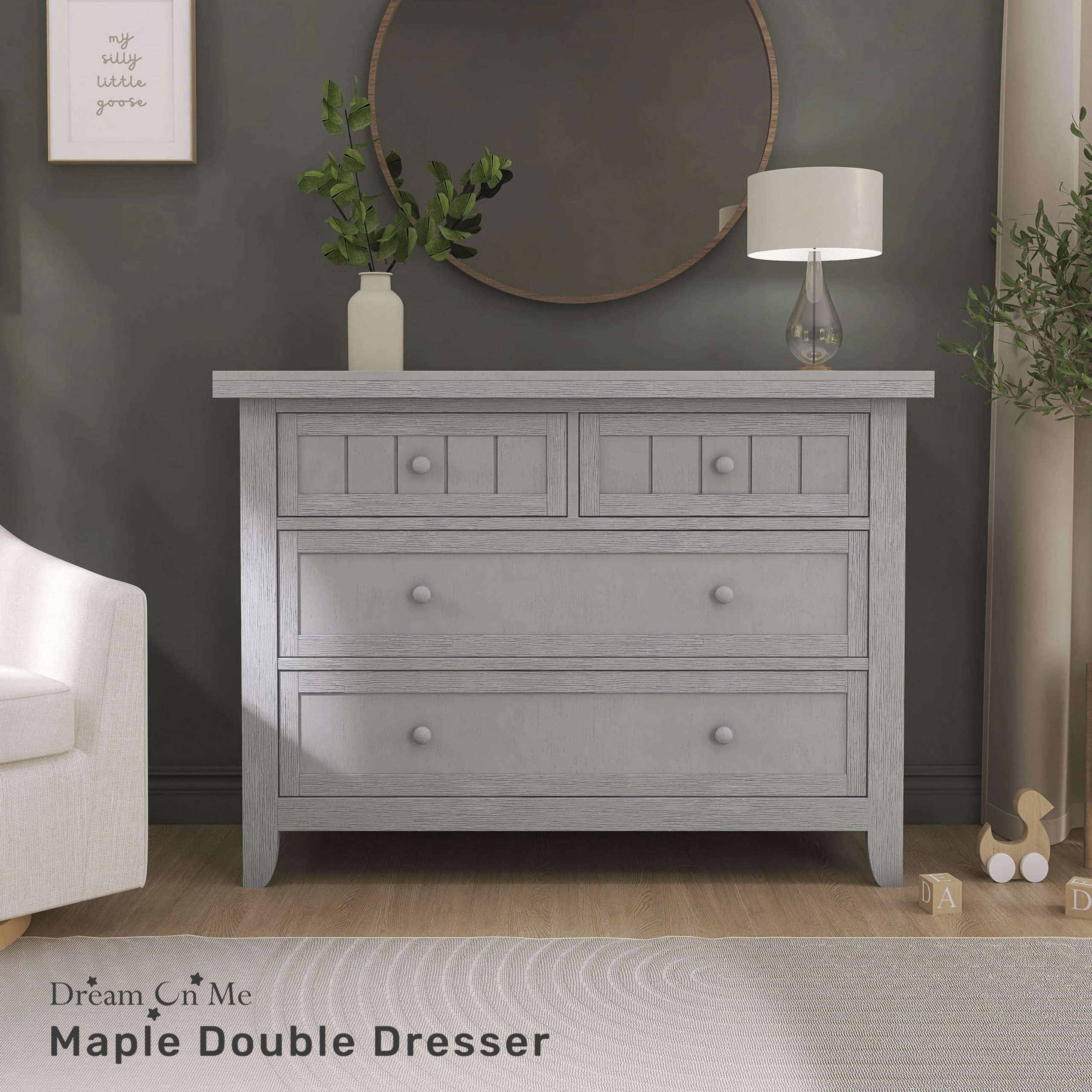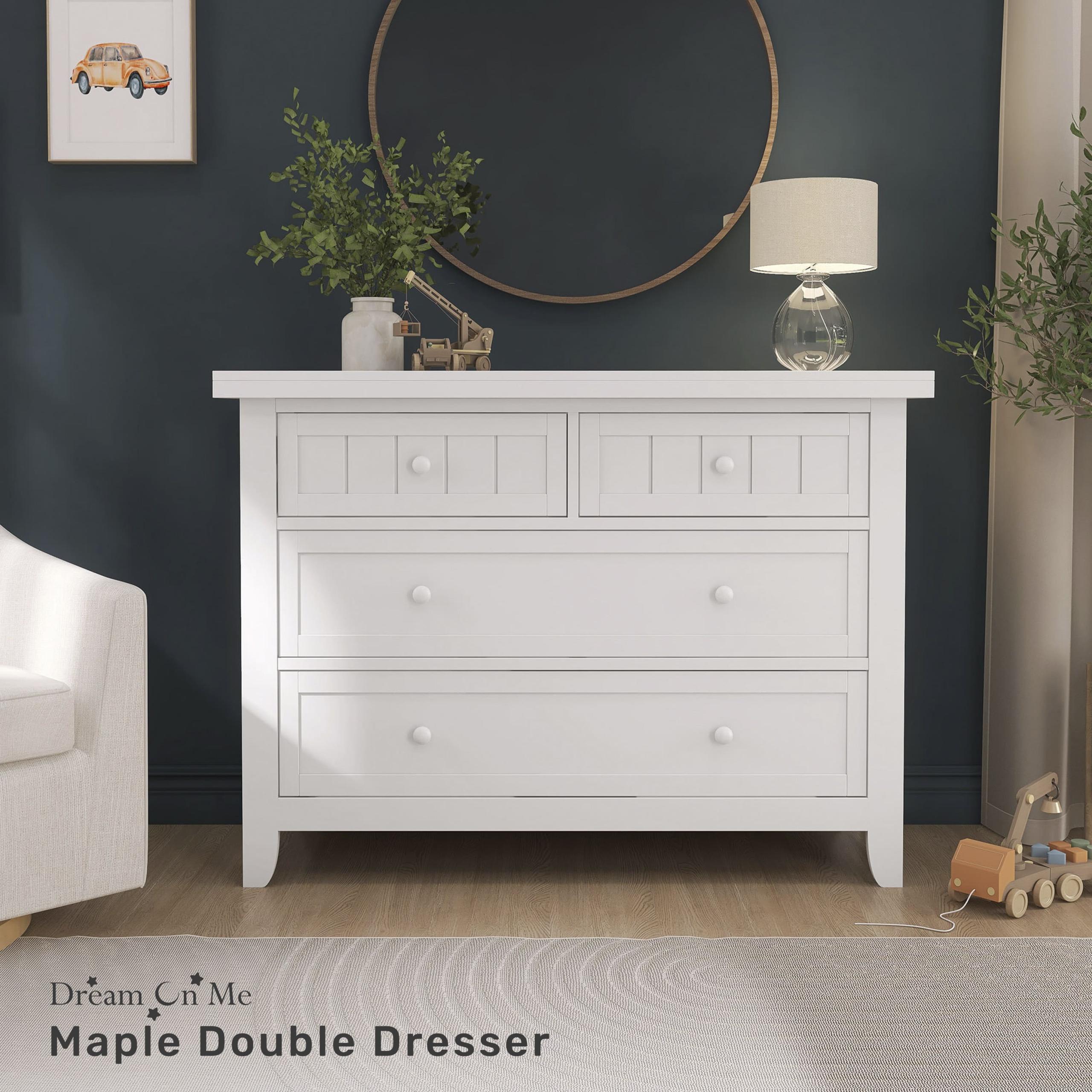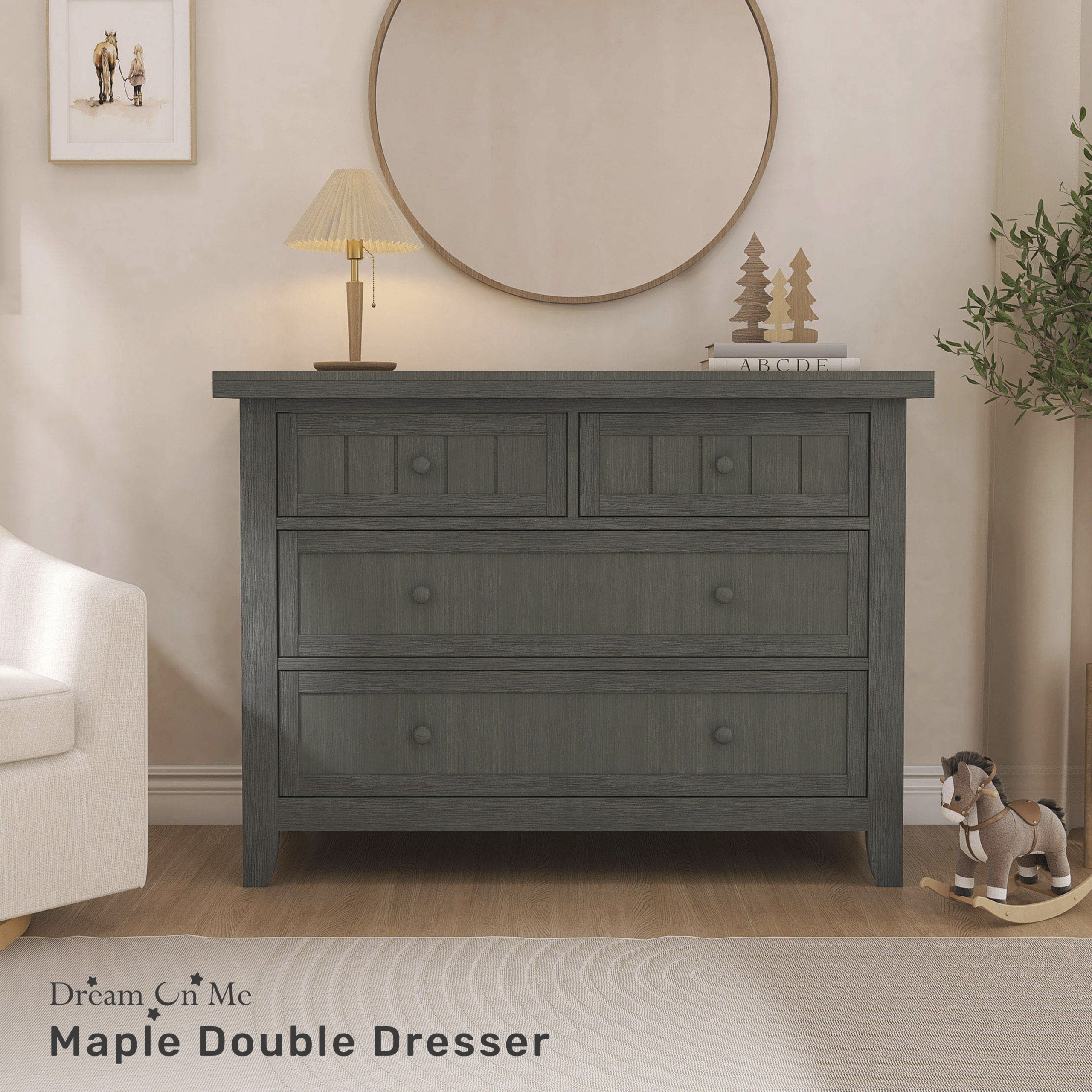 Dream On Me Maple Double Dresser captures the comfort and relaxing farmhouse elements with its classic framed plank pattern. This dresser is a great addition to your child’s nursery or bedroom. The wooden drawer pulls, clean lines and tapered feet compliment the refreshing finishes, while the four spacious drawers provide room for clothing and accessories. This Dream On Me 4 drawers dresser is crafted from durable solid wood, to work effortlessly throughout the years. This Dresser offers a little rustic charm to an ageless nursery.