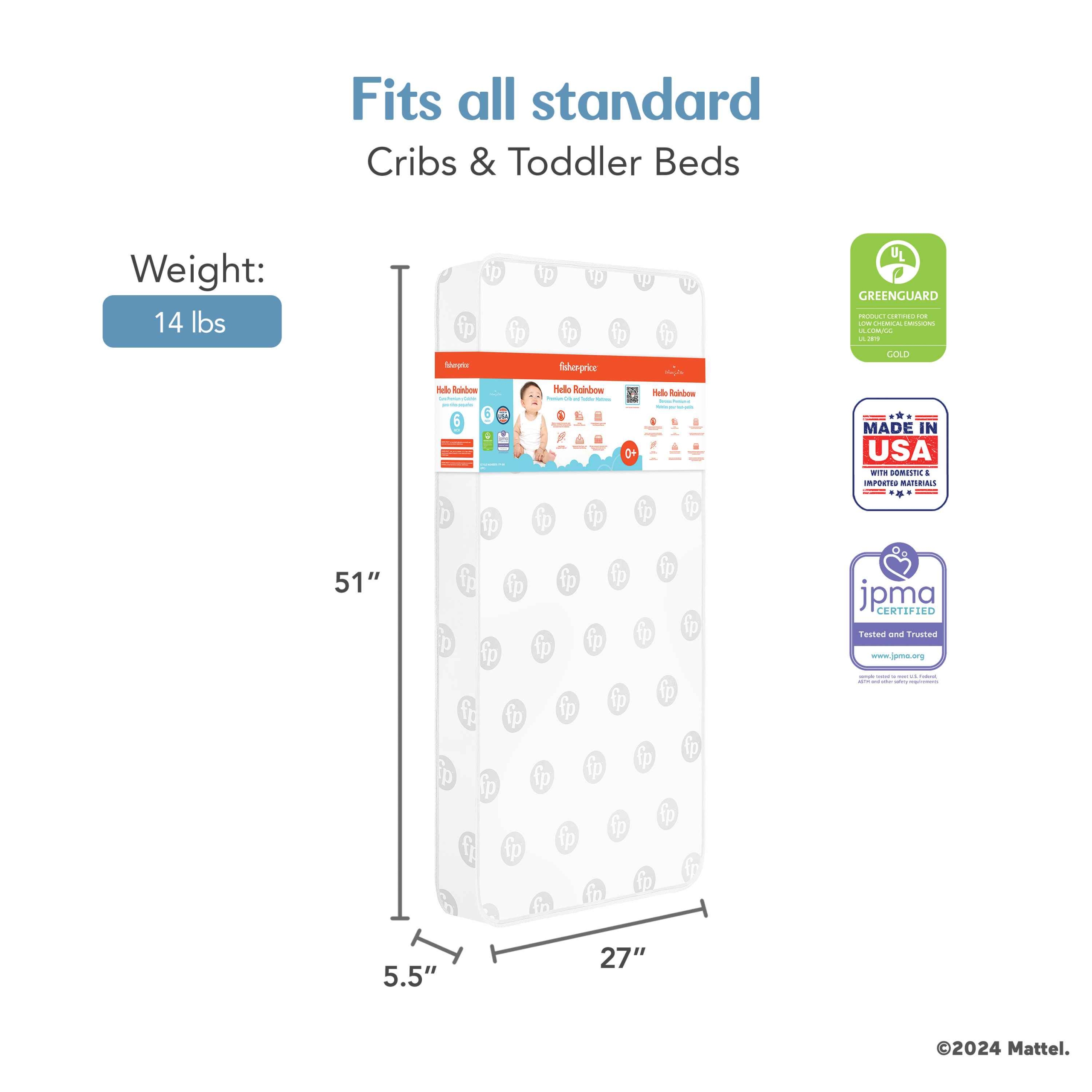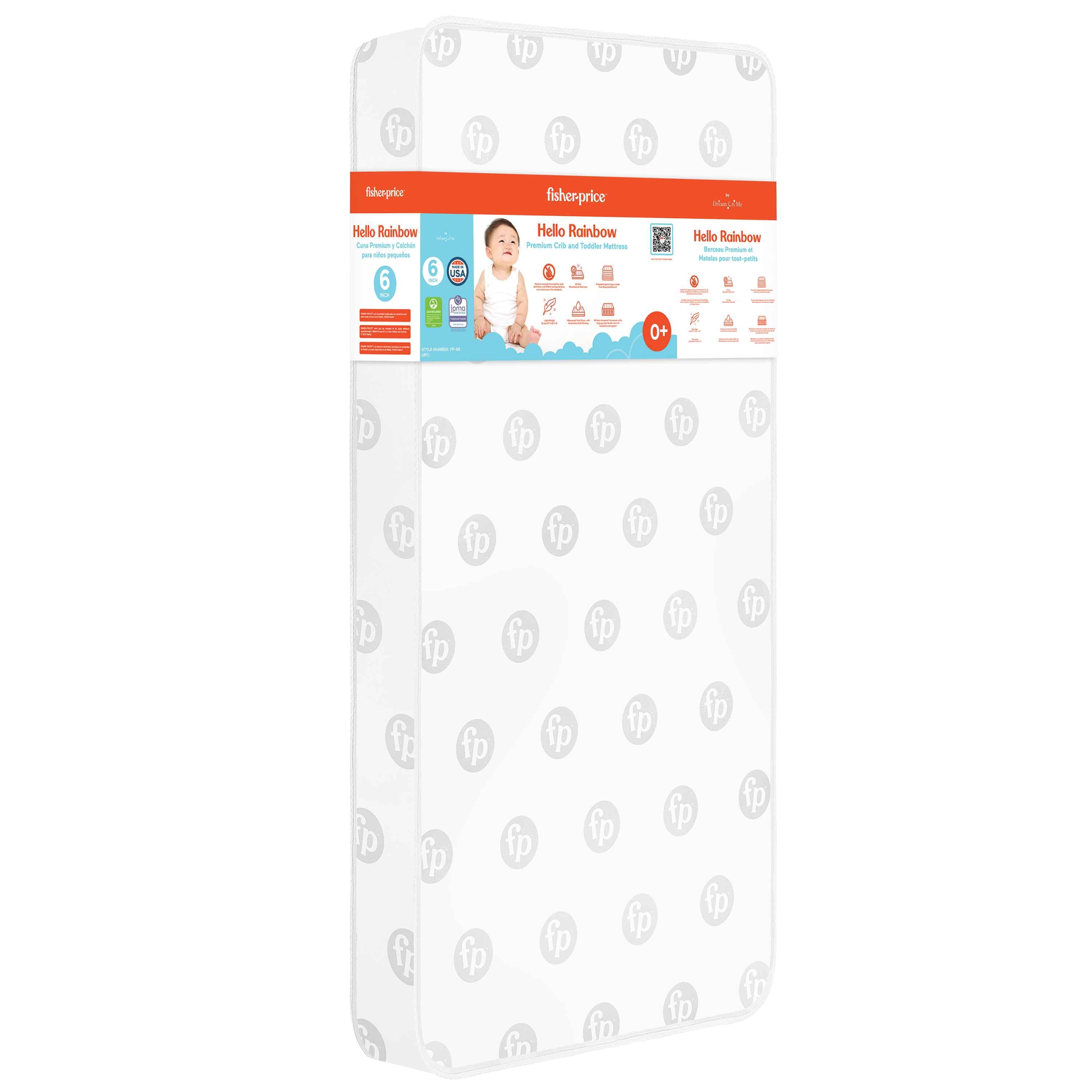 Meet the Fisher-Price™ by Dream On Me Hello Rainbow Mattress that combines comfort, durability, and safety in a design parents can trust. Featuring a sturdy, supportive build with metal springs and polyester fiber, this mattress provides the perfect balance for restful sleep. The waterproof vinyl cover protects against spills, and the flame-retardant materials meet safety standards to ensure peace of mind. Designed in a soft white with a classic gray print, this mattress offers a sleek and functional addition to any nursery.
